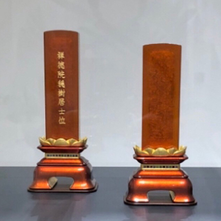 御位牌は当店で文字入れをしています。並び本金箔も当店にて職人による手押し工程で加工しています。一般的な代用金とは光沢が違ってきて人気です。お気軽にご相談・ご注文ください。